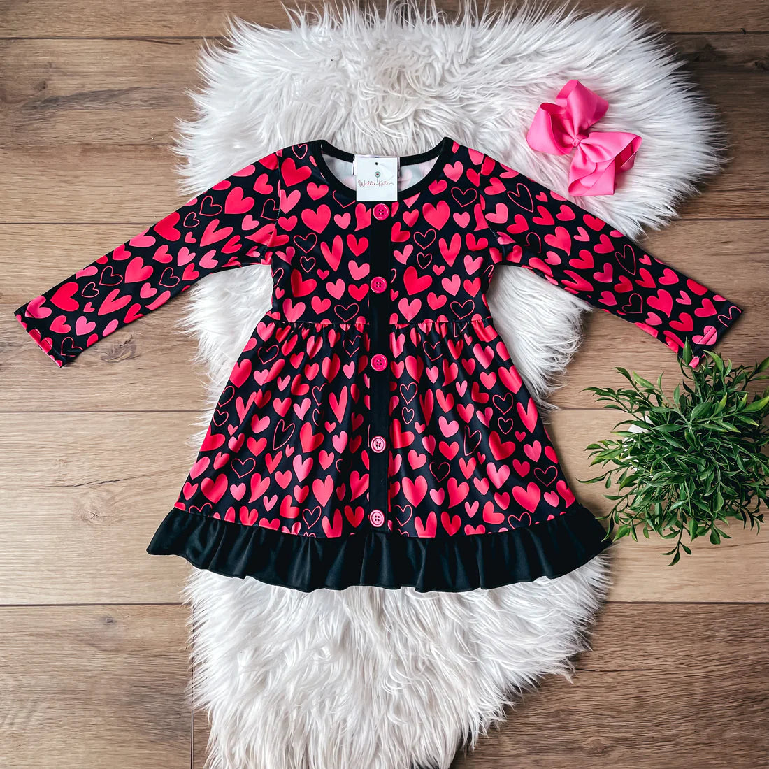 Get ready to fall in love with this dress! With hearts galore and a playful ruffle detail, it's perfect for adding a touch of whimsy to any outfit. Made from super soft fabric, it's as comfortable as it is adorable. (You'll heart it, we promise!)