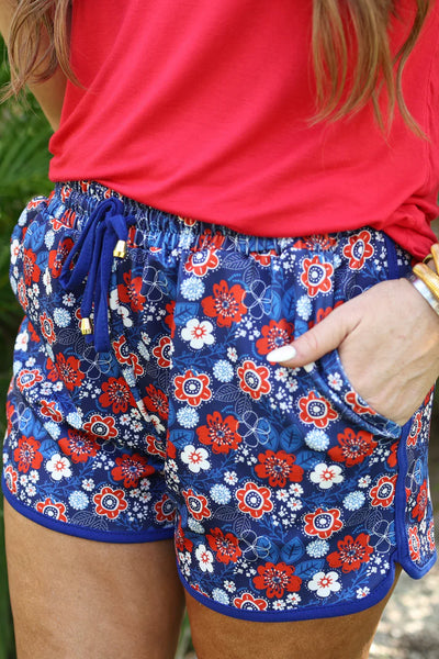 These mid-rise patriotic floral print shorts are so perfect for the 4th of July or just to show off your American pride! Get the effortless yet chic look with these shorts. They feature a mid-rise, tie waist drawstring, & side pockets. These are a relaxed fit.