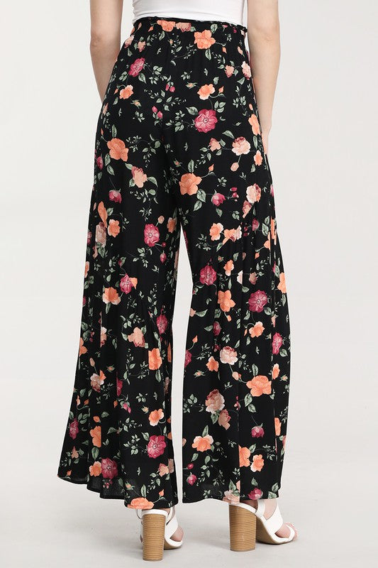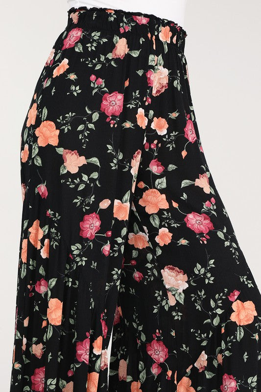 WILD LEG PANTS WITH SHIRRING RUFFLE SOFT, COMFORTABLE, BREATHABLE, LIGHTWEIGHT MATERIAL. PERFECT FOR CASUAL WEAR. MODEL IS WEARING A SIZE SMALL. MODEL IS 5'7" AND IS WEARING A SIZE SMALL.