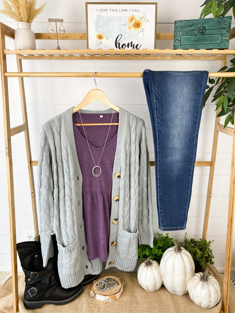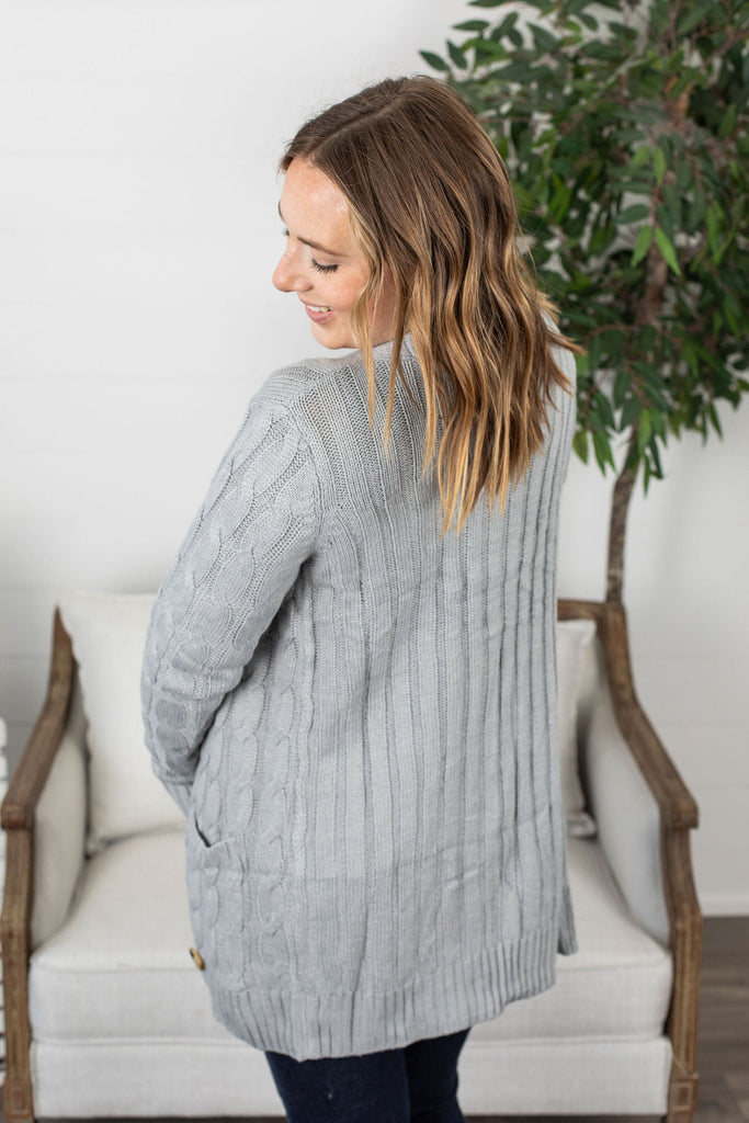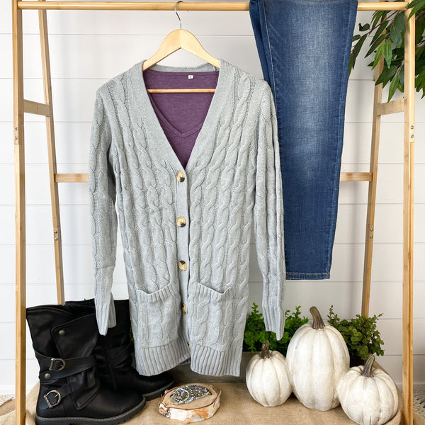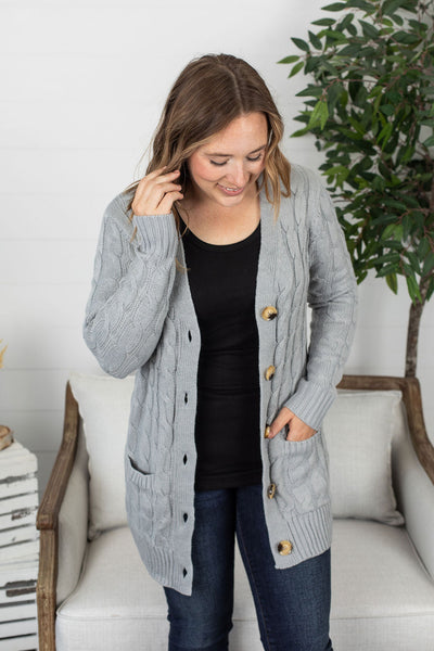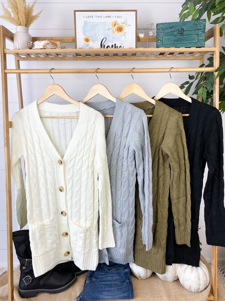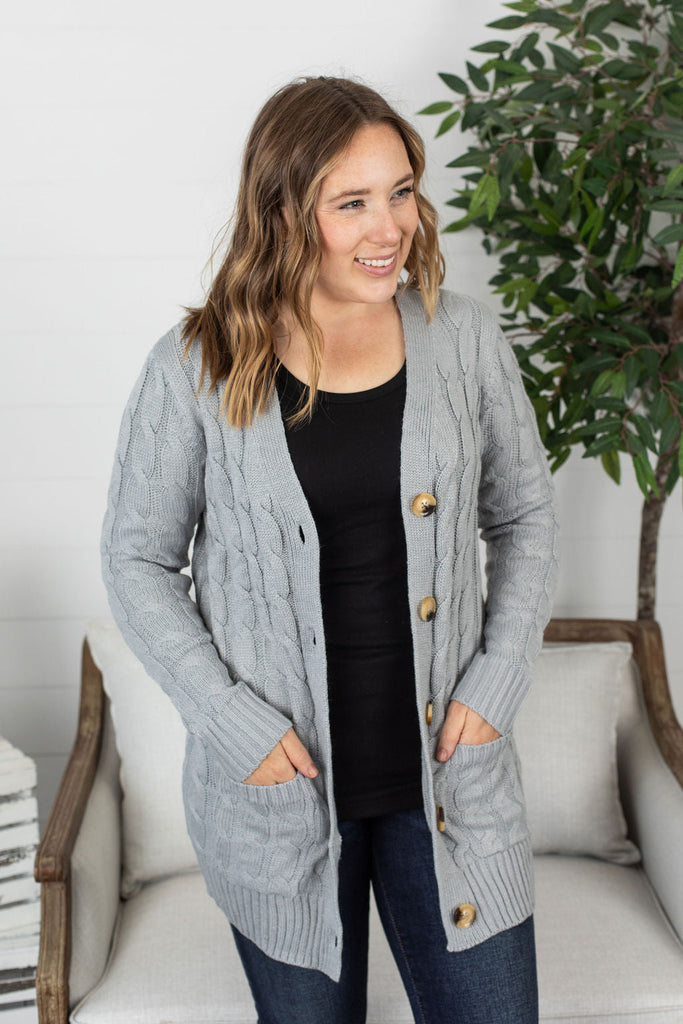 This cardigan is perfection! These have good stretch and fits true to size (model liked her usual size, size small shown here). The fabric has good weight to it, making it extra cozy! This combo of cable knit sweater design with buttons and pockets - all in a cardigan style has us swooning!