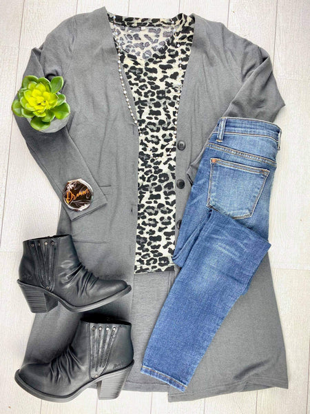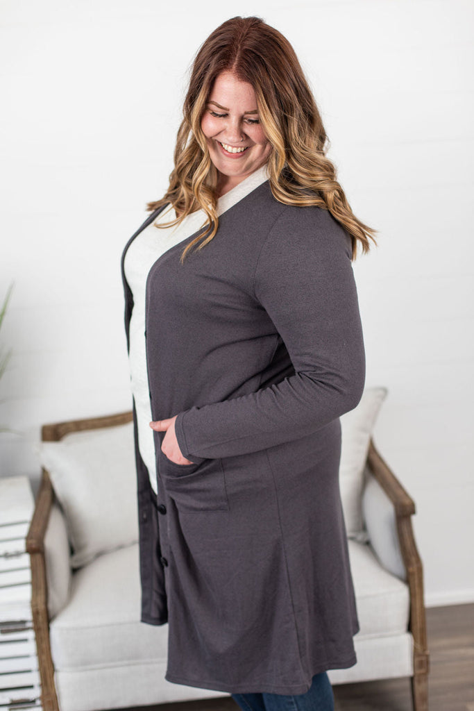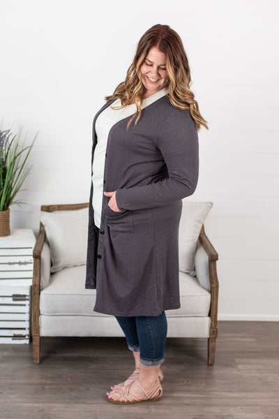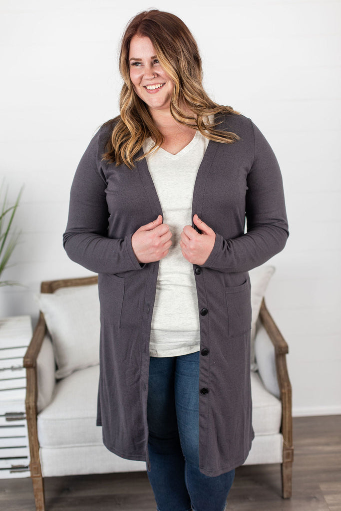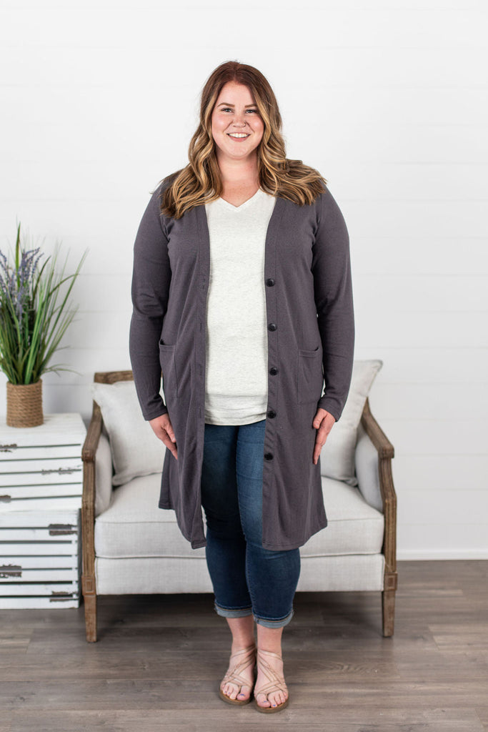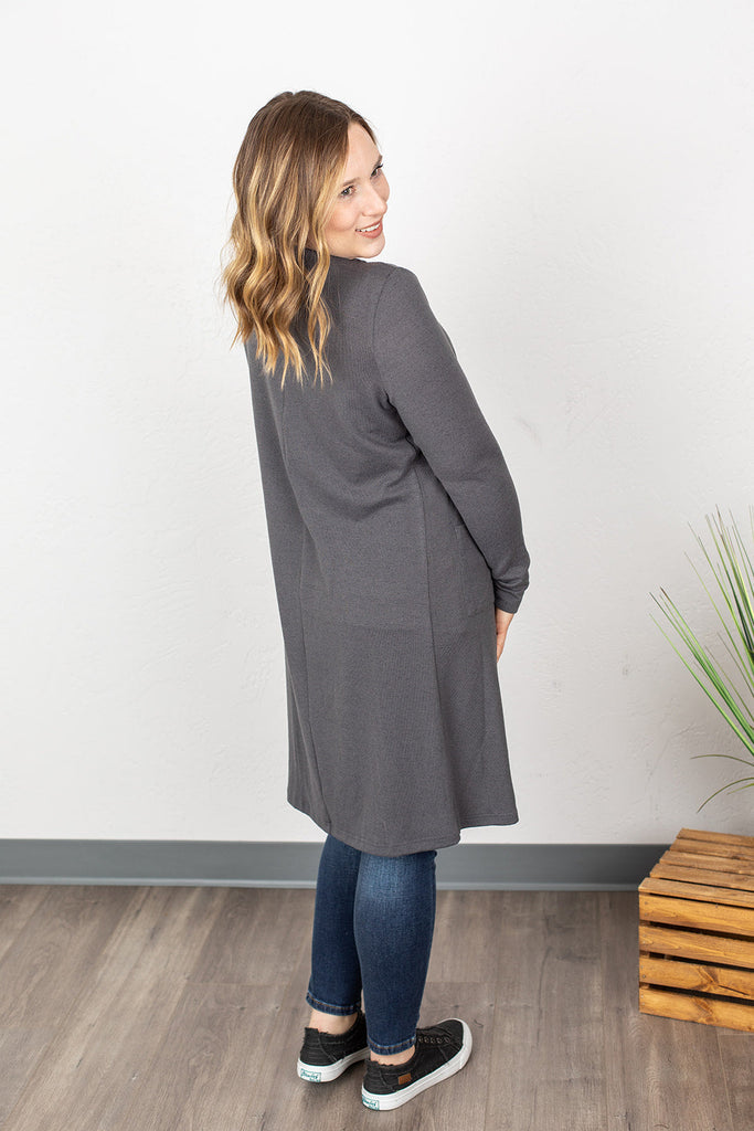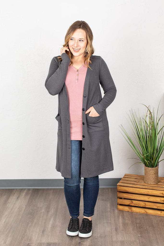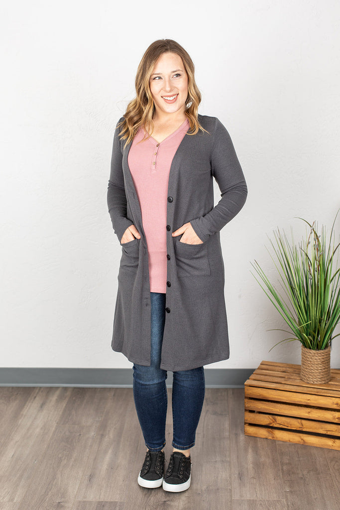This cardigan is going to become your new go-to item to pair with everything in your closet! Longer than a traditional cardigan, but not quite full-length like a duster, we think this length is perfect! Plus, its so soft and has pockets, you'll never want to take it off!