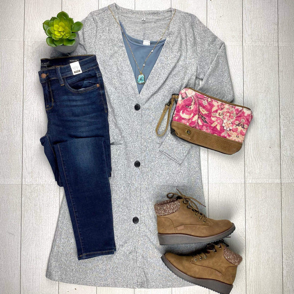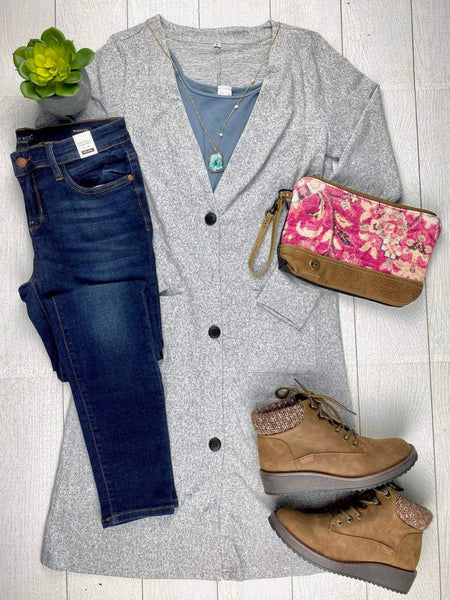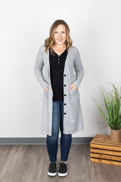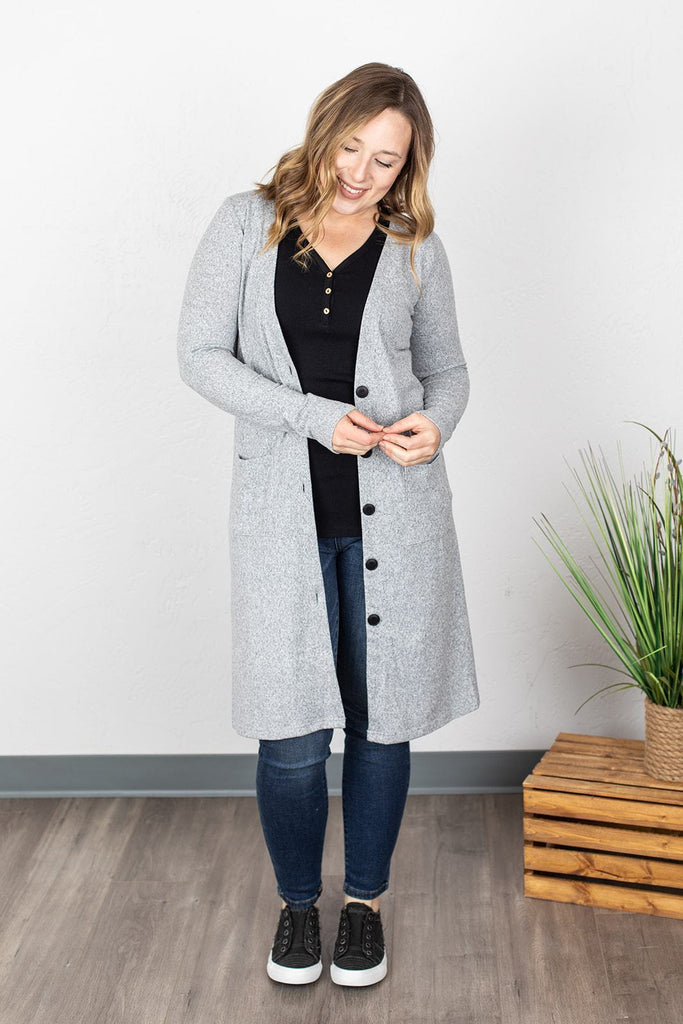 This light heather grey cardi is the perfect neutral! Longer than a traditional cardigan, but not quite full-length like a duster, we think this length is perfect! Plus, its so soft you'll never want to take it off!