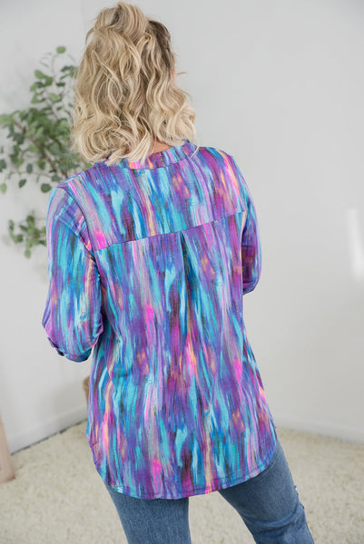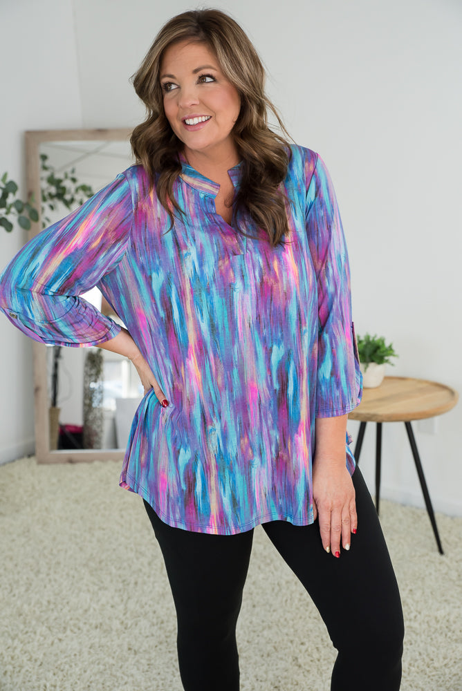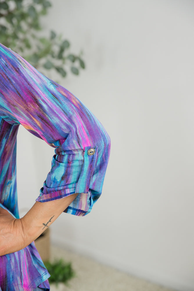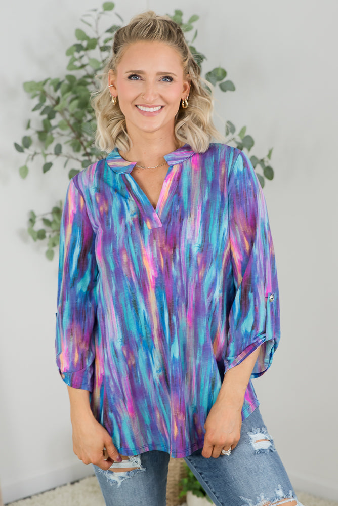 The watercolor print on this Lizzy top is stunning! The pink, purple, mint and gold are a fantastic combination that will brighten your day. Lizzy features a wrinkle-free fabric, three-fourth length sleeves, tab detail on the sleeves and a v-neck with a mock collar.