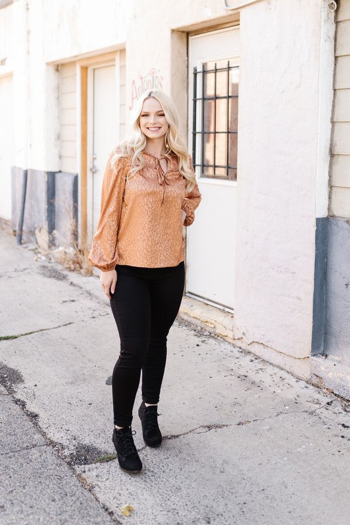 Ring in the holiday season in perfect style with this gorgeous top. The silky feel to the fabric paired with the shimmer of leopard print has us all envisioning the different ways it can be styled. We adore the unique color and can't help ourselves from gravitating to it.