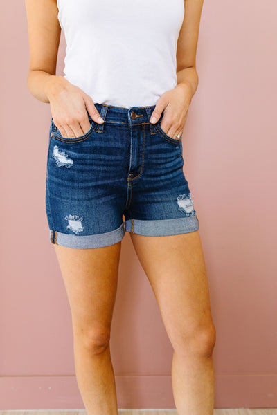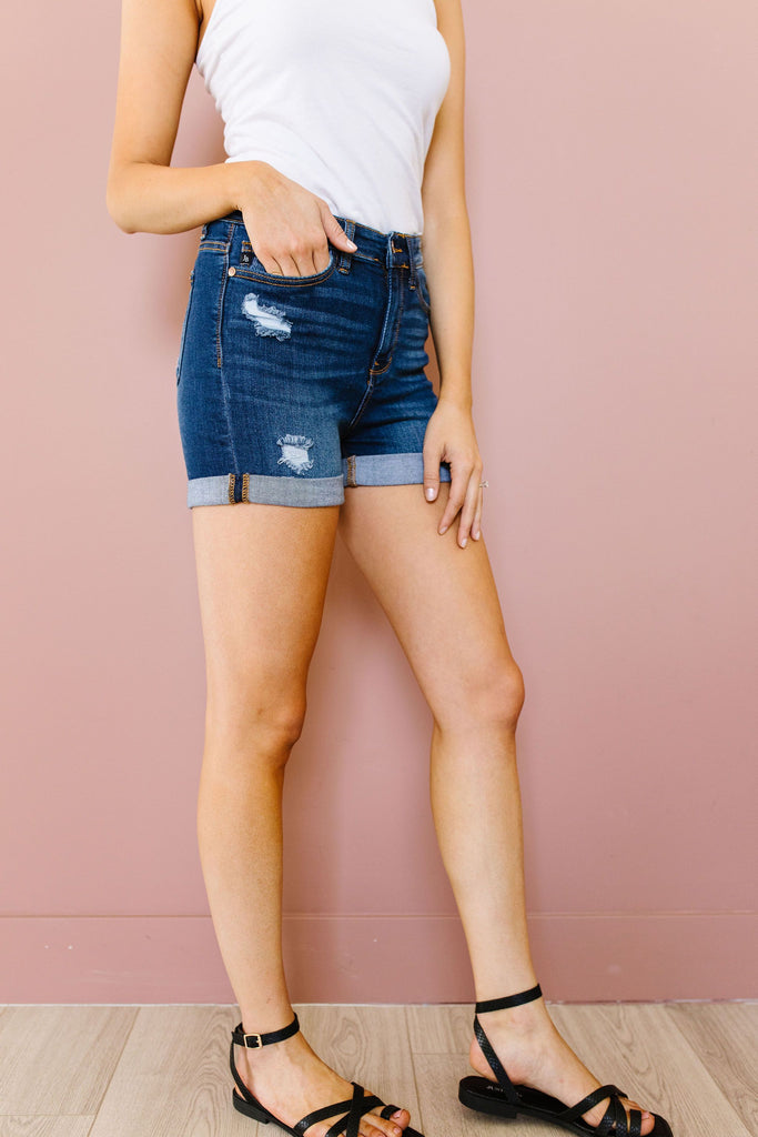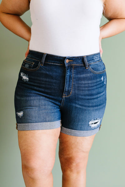 Oh, how I love a good pair of mid-rise denim shorts! These dark wash beauties are the holy grail of summer denim….plus, they’re holey too! They’ve got holes and distressing at the hip and thighs and have cute rolled cuffs.
