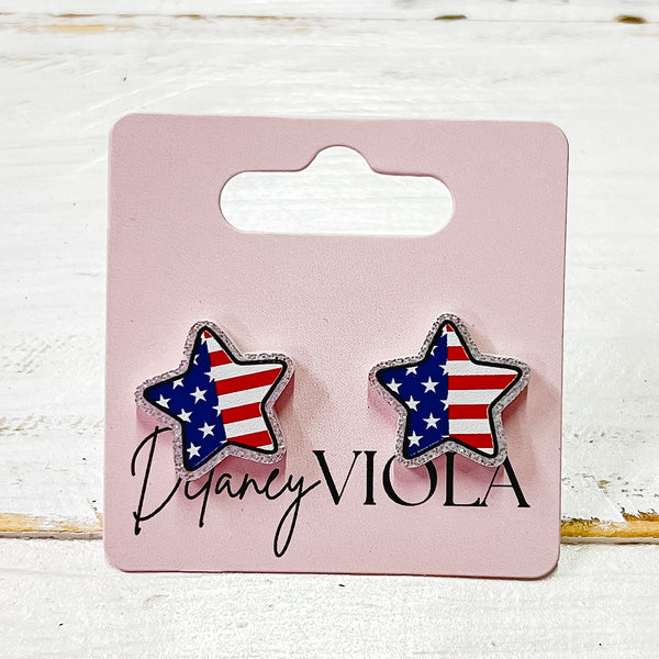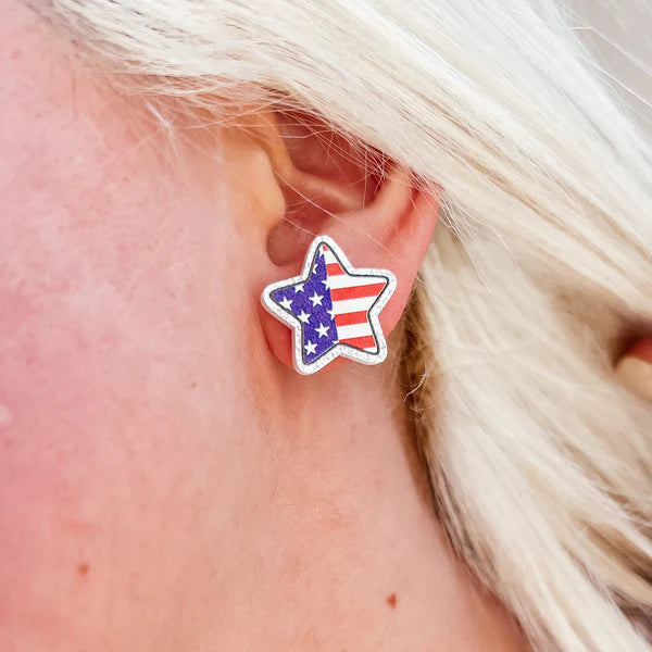 Get ready to sparkle and show off your patriotism with these Flag Star 4th of July Glitter Stud Earrings! Featuring a stunning flag design with a silver glitter border, these earrings are perfect for any Independence Day celebration. Make a statement and add some flair to your outfit with these fun and festive earrings.