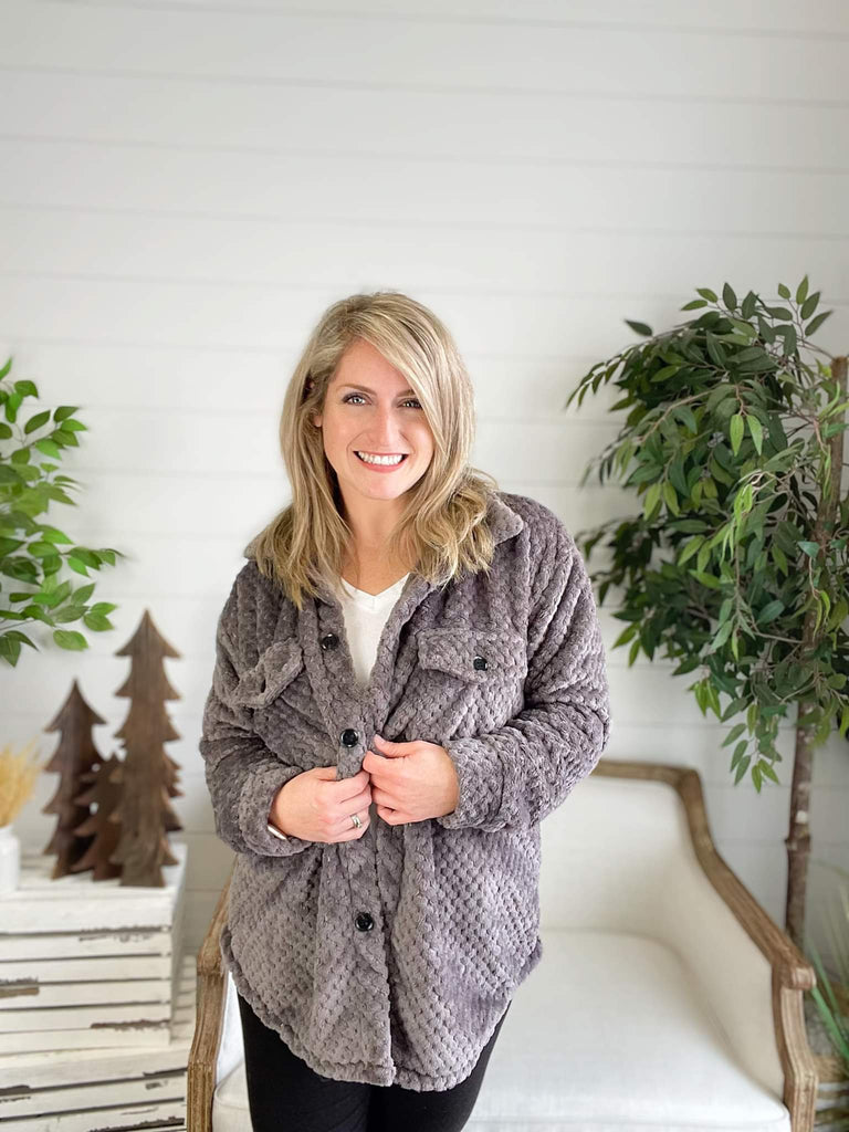Get ready for the coziest button fleece you will wear all season long! The same amazing fleece you see on the outside is the same on the inside so you will stay warm on those chilly days. Front buttons for closure as we as two breast pockets with buttons. A must have!