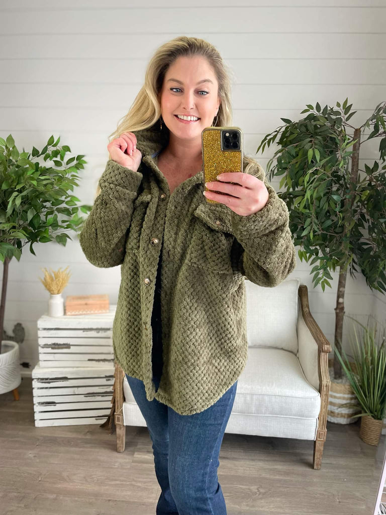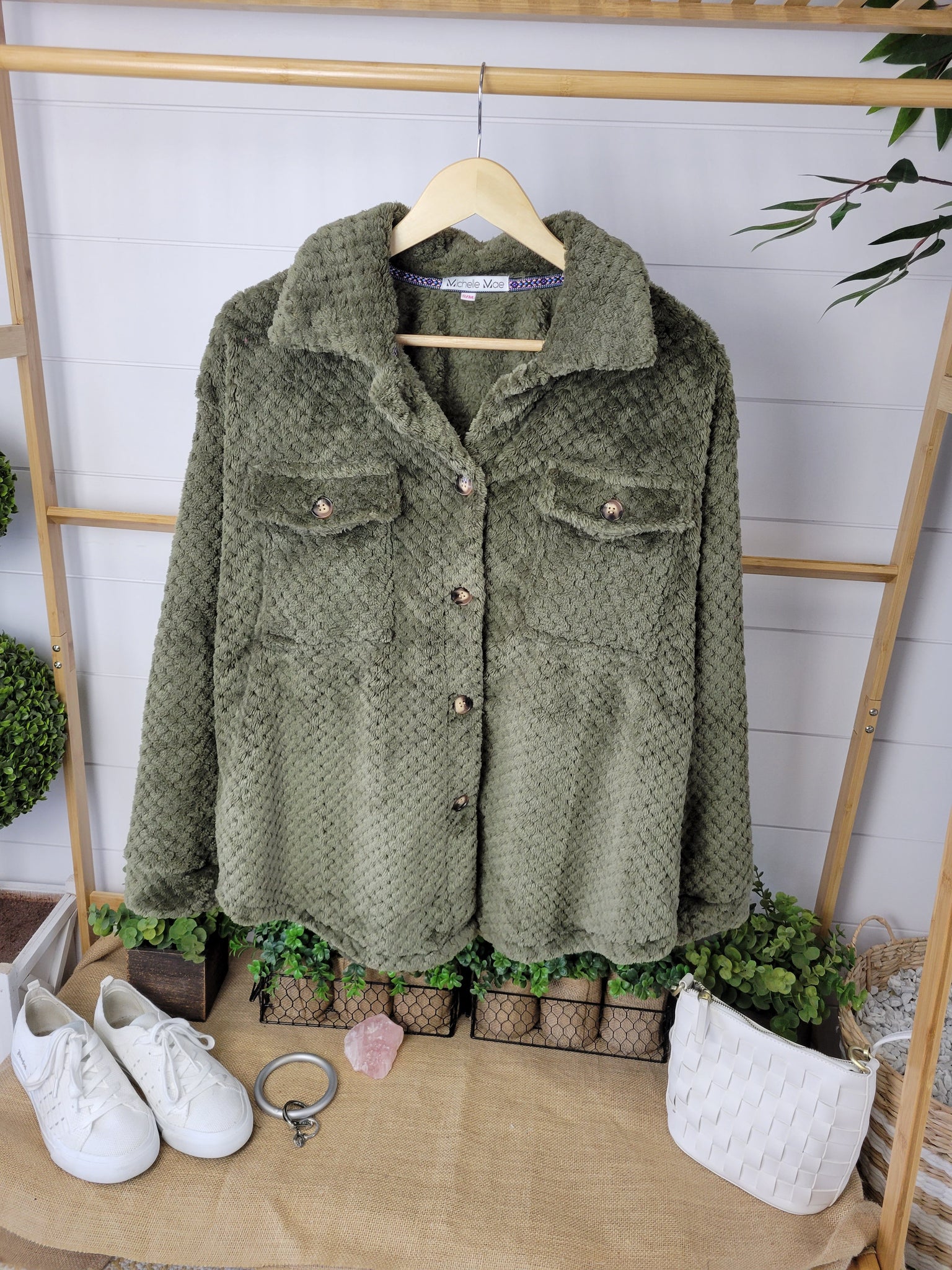 Get ready for the coziest button fleece you will wear all season long! The same amazing fleece you see on the outside is the same on the inside so you will stay warm on those chilly days. Front buttons for closure as we as two breast pockets with buttons. A must have!