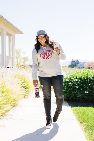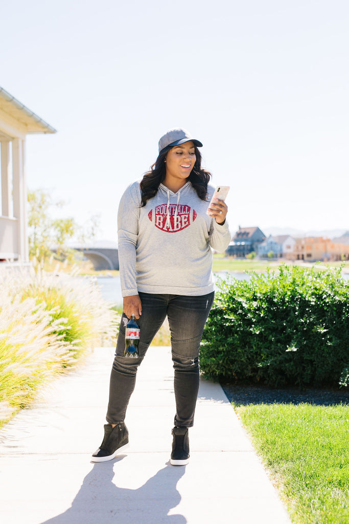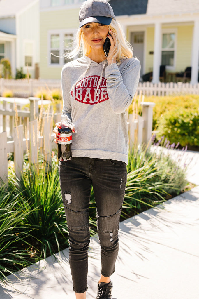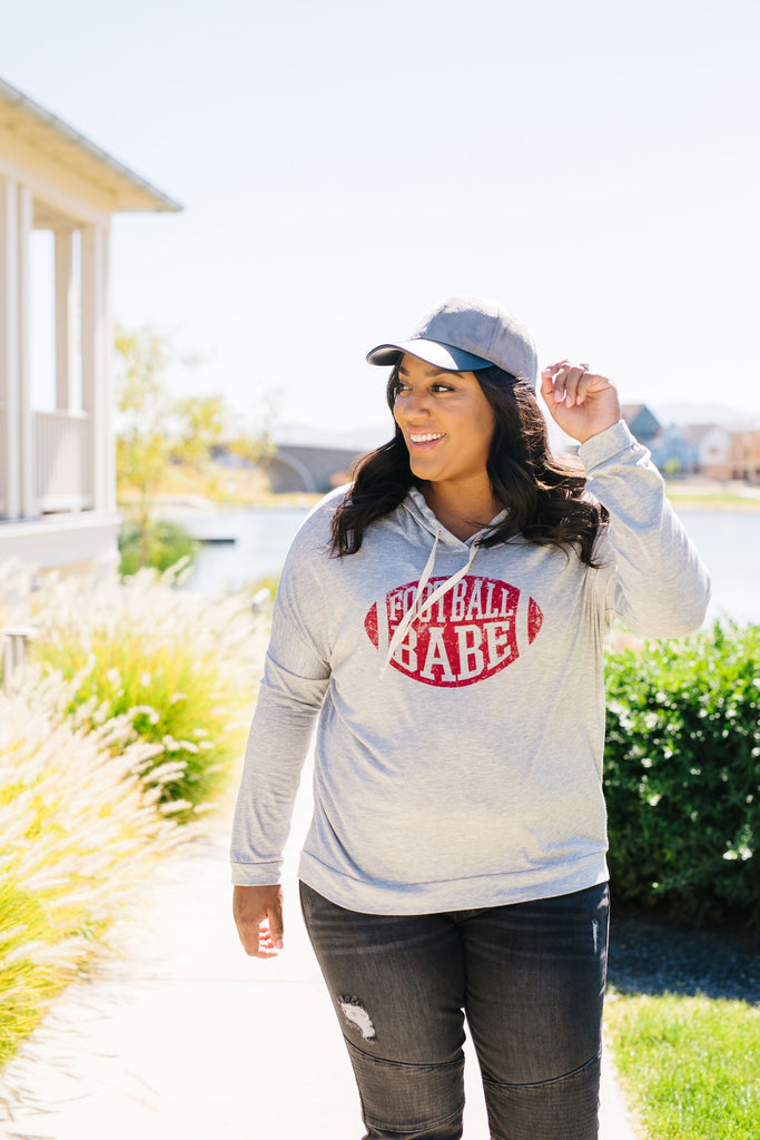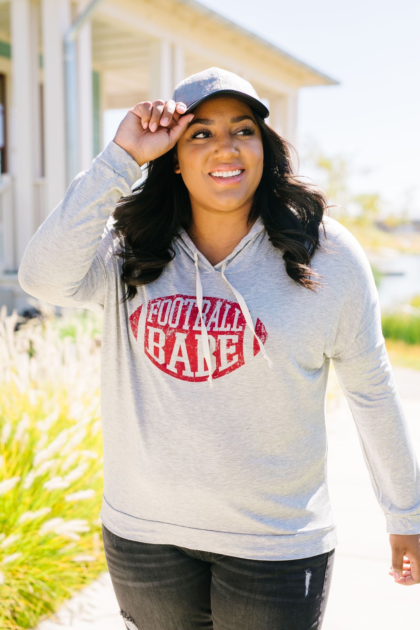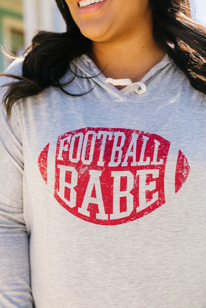 Football Babe = A stylish girl seen to be supporting her team through thick and thin, win or lose. Made from soft and lightweight t-shirt knit, this hoodie is the perfect way to support your team. It's got a drawstring hood, dolman sleeves, and a red football graphic which proclaims your loyalty to the sport.Â