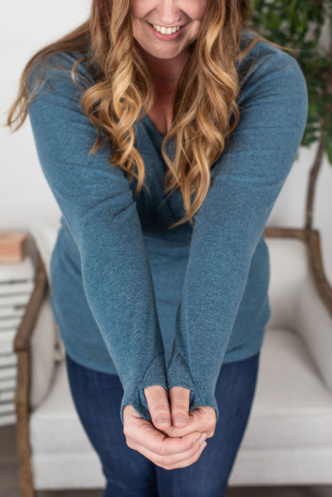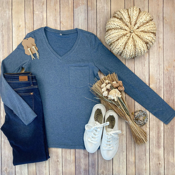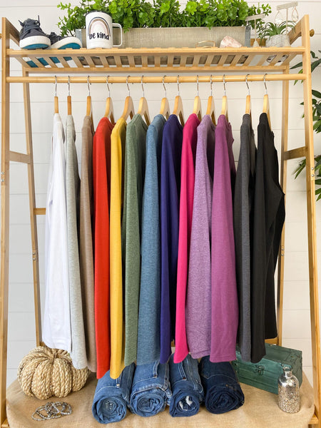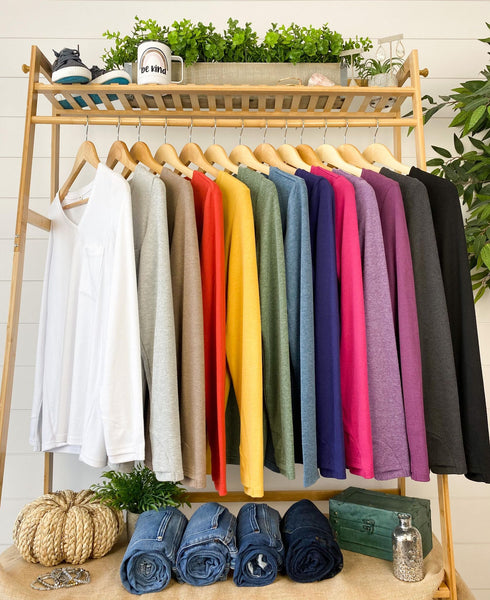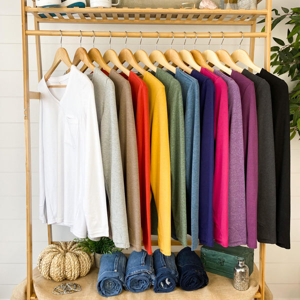 The perfect long sleeve pocket top! Amazing fabric that is warm and sure to keep you cozy during the cooler weather. These also make the perfect pairing for any vest and are super easy to layer! The are VERY soft and stretchy too, plus they have a front pocket as well as thumbholes - which we think is the perfect combination!
