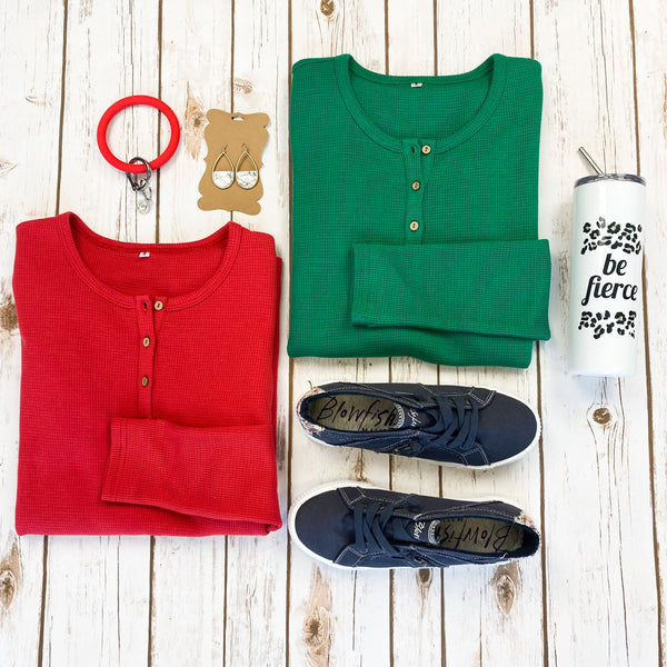 The perfect long sleeve Henley top! Amazing fabric that is warm and sure to keep you cozy during the cooler weather. These also make the perfect pairing for any vest and are super easy to layer! They feature functioning wood buttons as well as thumbholes - which we think is the perfect combination!