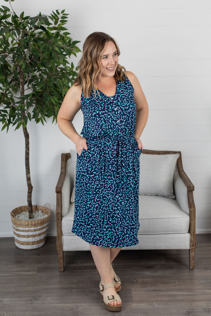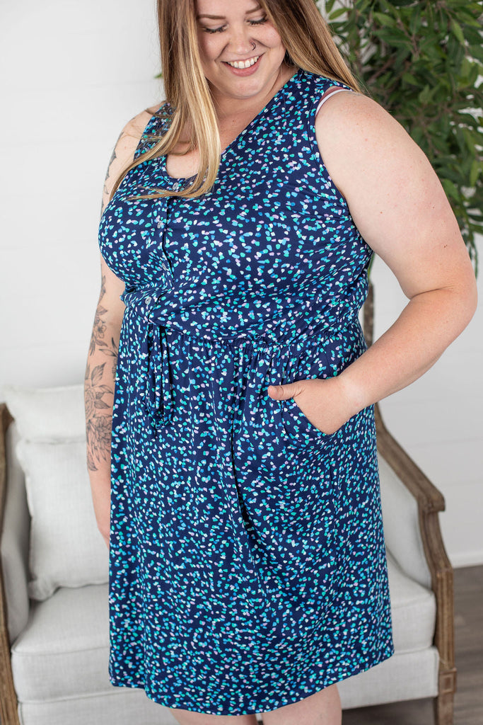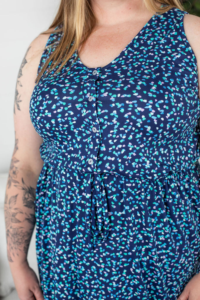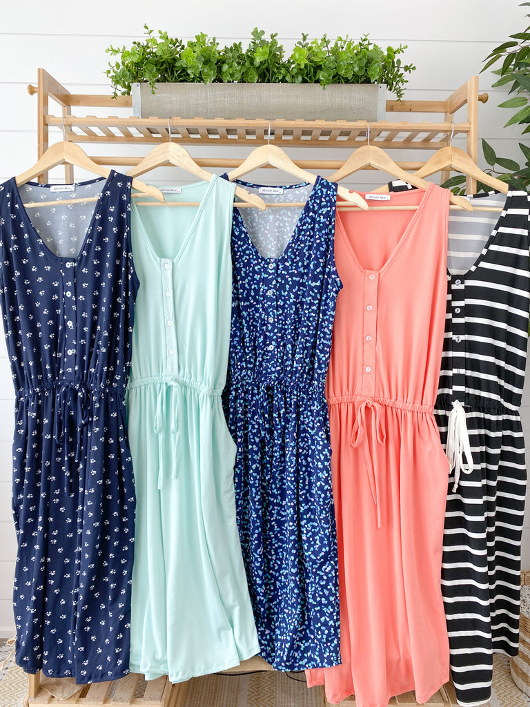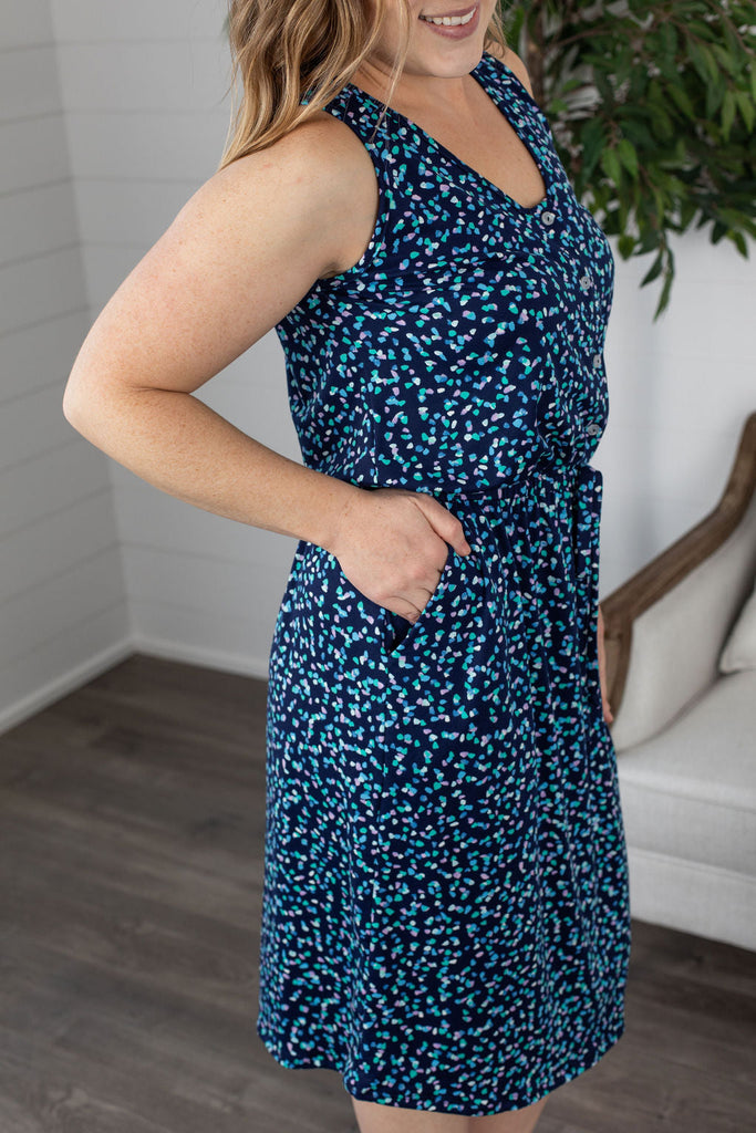 Meet Sadie-your next go-to tank dress for spring and summer! Sadie is sweet, but ready for work or play! A soft leggings material that has good stretch, pockets, stretch band, faux tie, and functioning buttons! Wear to work with a blazer or cardigan or so sleeveless on warm days! A perfect dress to add to your closet!