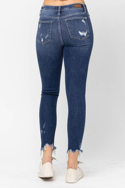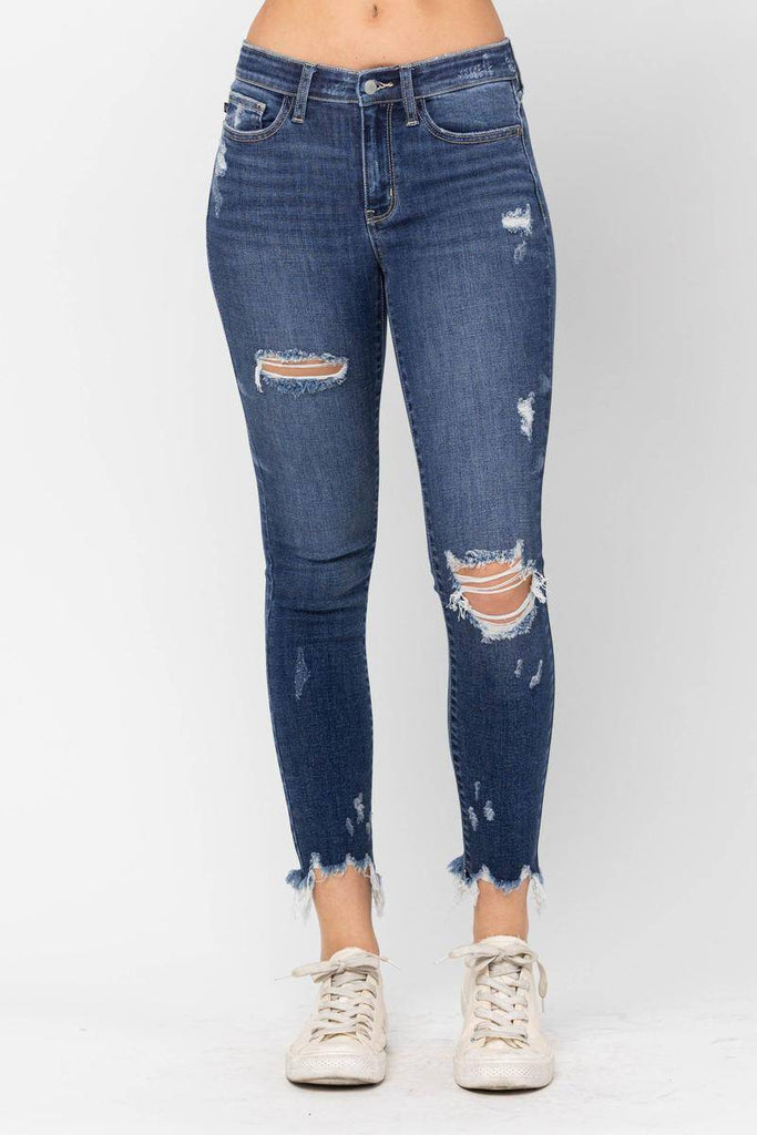 Judy Blue Mid-Rise Raw Hem Destroyed Skinny Jeans