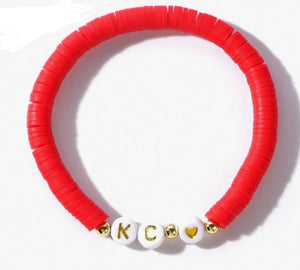 "Add some flair to your game day outfit with the KC Stretch Bracelet featuring red beads, a gold KC logo, and a heart charm. Show your love for the Chiefs in style!"