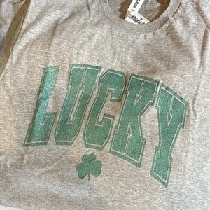 The “lucky” graphic tee is a must-have for your St. Patrick’s day wardrobe! Features glittler green lettering on an ash grey tee of course, because you sure don’t want to get pinched! Tee is short sleeve with crew neck and cuffed sleeve. Material is 95% polyester/5% spandex