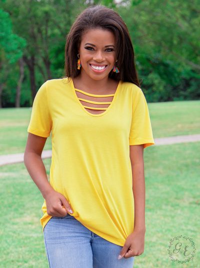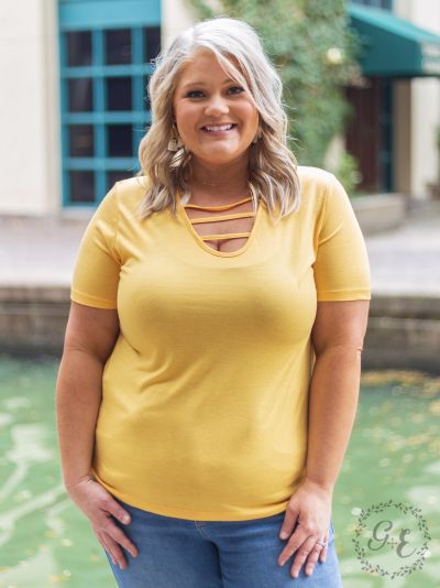 A great color for spring and summer. Add this adorable classic tee in a great color and cute neck line for a pop of color in your wardrobe.