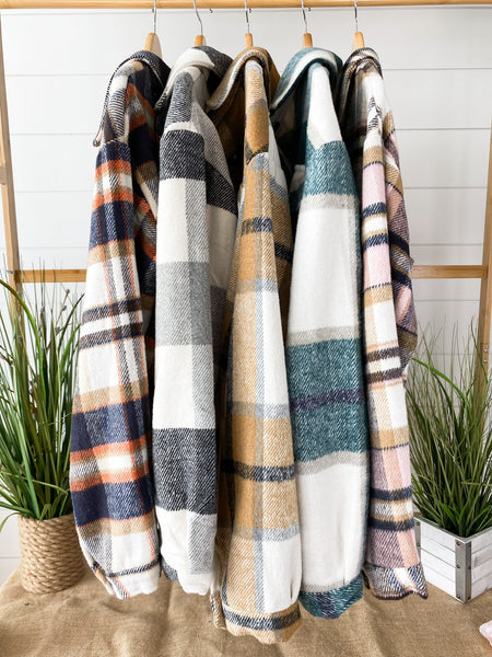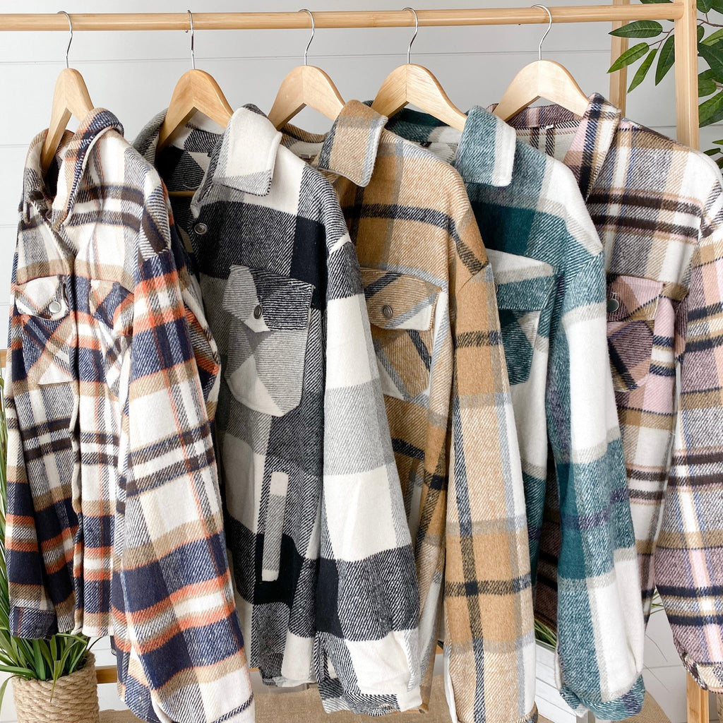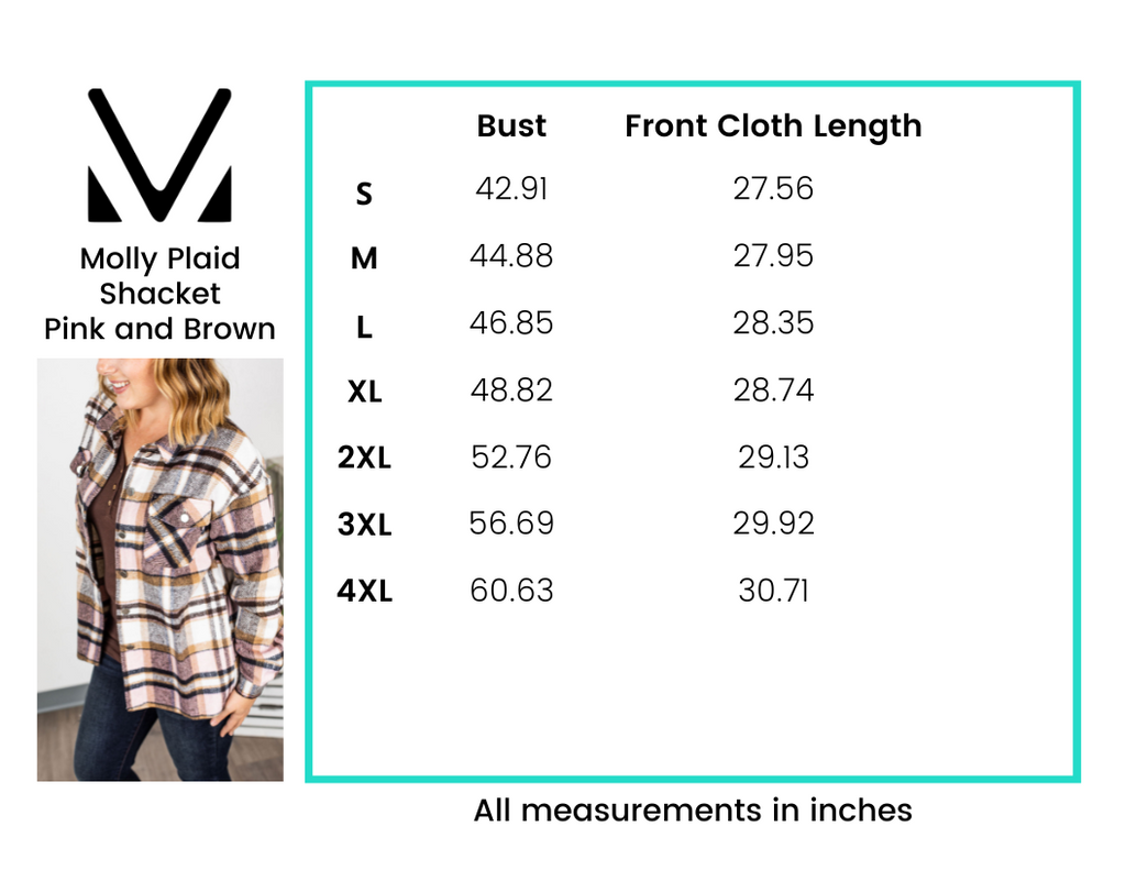 Meet Molly! She's your classic plaid shacket, with a straighter bottom hem as well. All buttons are functioning and the two front upper pockets are fold over, functioning pockets with a button!