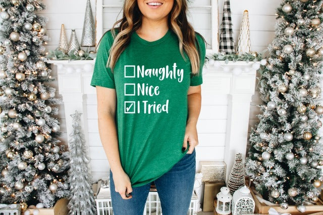 Are you naughty or nice? This "I tried" tee is sure to spark some serious holiday debate – we’re staying out of it! Snag this festive top and show the world where you stand (or don’t stand) on Santy’s list.