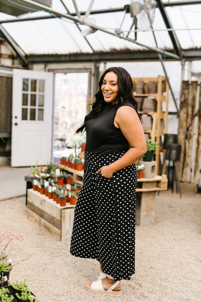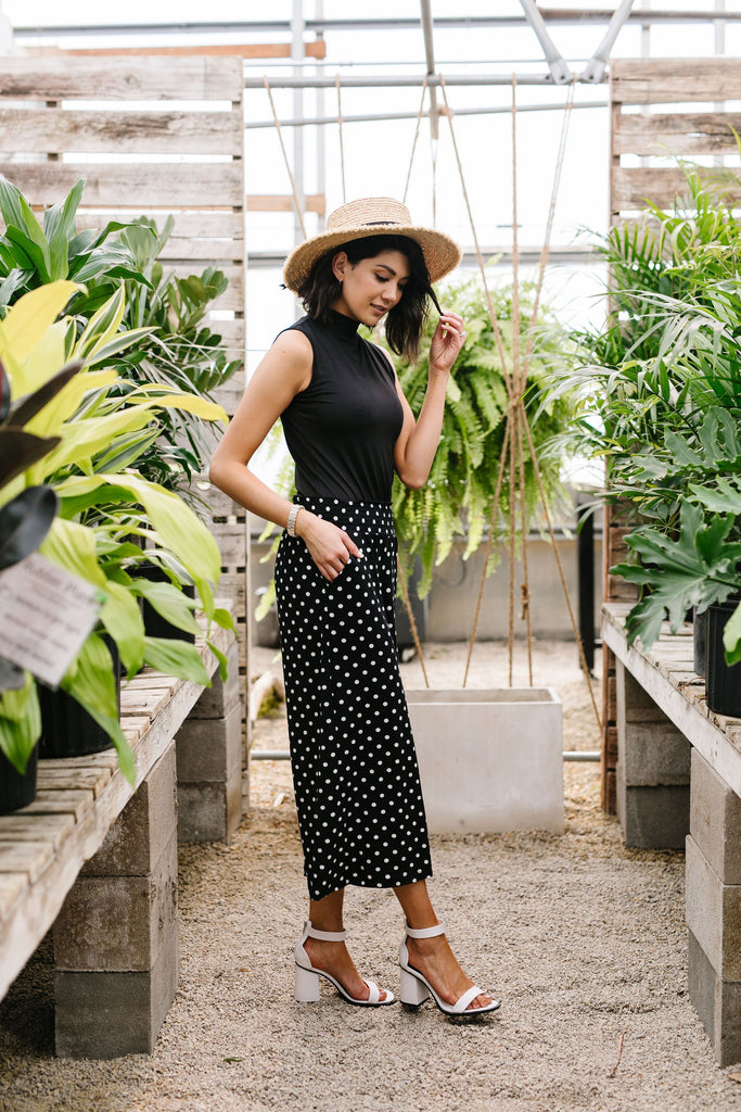 These absolutely adorable cropped gaucho pants are made from a lightweight, buttery soft black knit scattered with white polka dots. The cropped wide legs are the perfect length for spring, and they’ve got a smocked waist and convenient pockets.