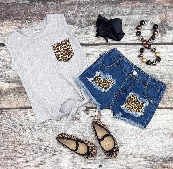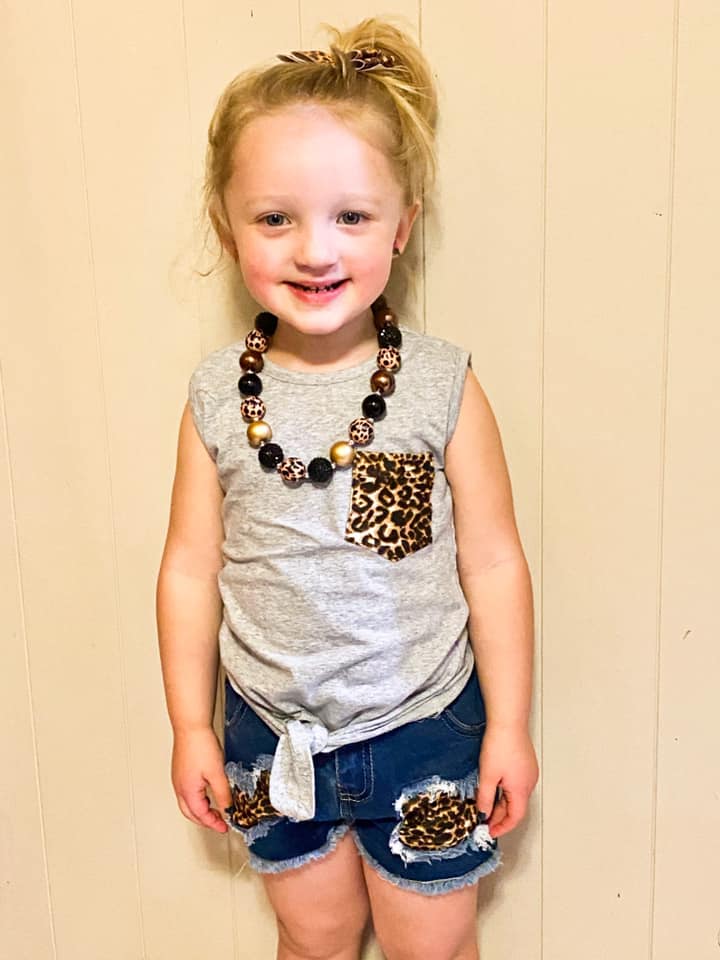 The cutest leopard outfit that is perfect for summer.  Shorts feature an adjustable waistband.  Necklace sold separately.
