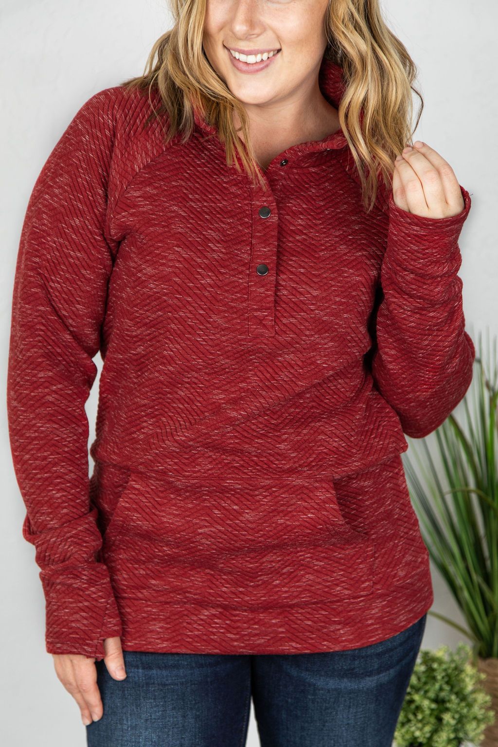 Quilted Button Snap Pullover - Red