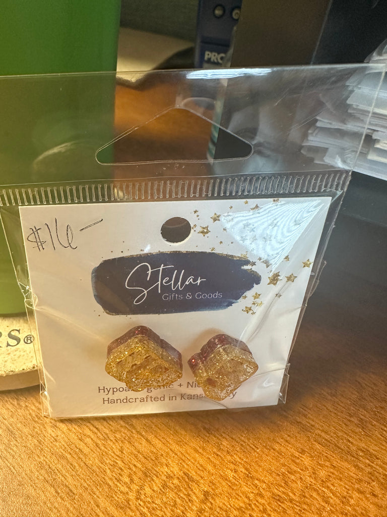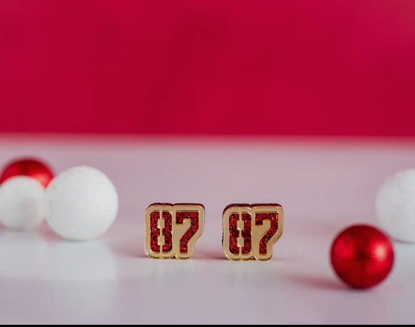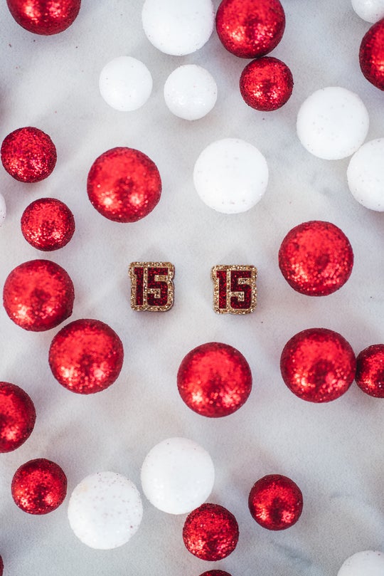 Red & gold glitter double layered 15 studs. Show your love for our favorite quarterback!! These are double layered acrylic and 1/4 inch thick. 14mm x 13mm Great for sensitive ears!