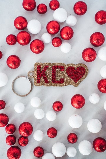 Red & gold glitter double layered KC heart keychain. 1.4 x 3.5 inches, 1/4 inch thick. Finished with plastic keychain connector and 30mm keyring.