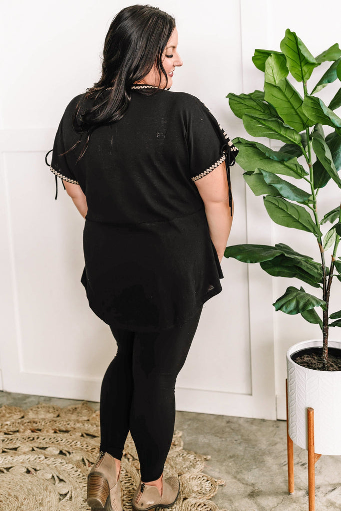 Savanna Jane Embroidered Top With Tie Sleeve Detail In Taupe & Black