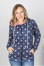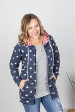 Nothing says USA like Stars and Stripes! This classic zip up hoodie had an amazing faded denim blue base, with white stars, and of course stripes accents!