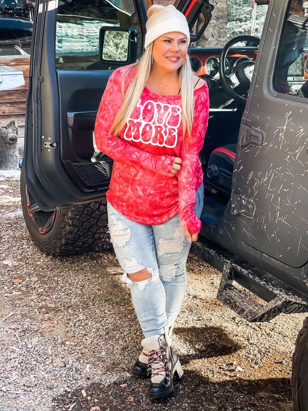 Adorable red tie dye tee that looks like a bleached tee! Super soft/high quality rayon/span fabric. Features a wide boatneck that can be worn on or off shoulder and thumbhole cuffs.