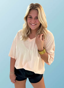 Your favorite boyfriend tee, in v-neck style! Cute, comfy, and can be styled so many different ways! Tee is very oversized, drop shoulder. box tee style, and v-neck. Material is a soft and lightweight 100% cotton. We do recommend sizing down one, as these are overszied. Wear it long, side tucked, or bra tucked to style! Model is wearing shirt front tucked