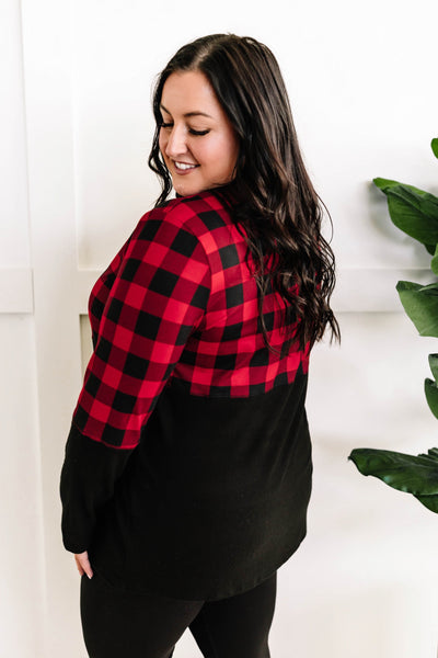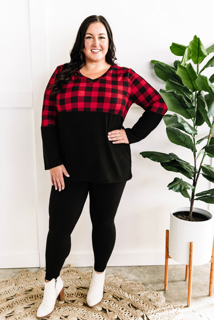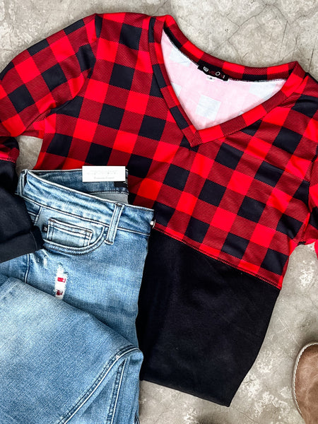 V Neck Buffalo Plaid Top In Red & Black