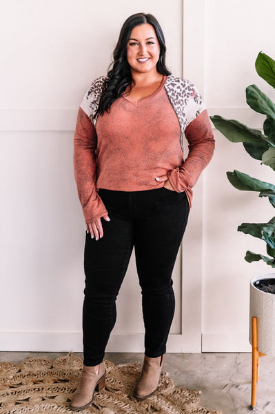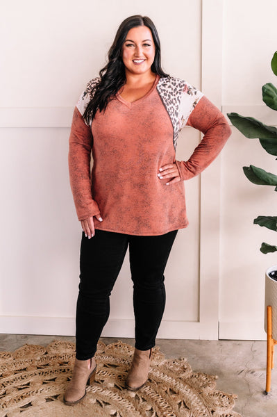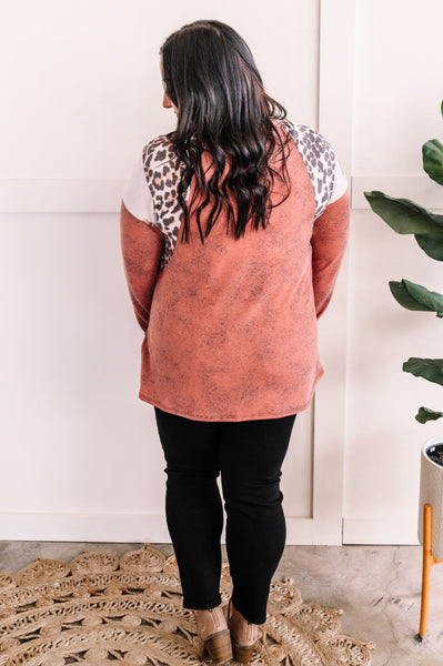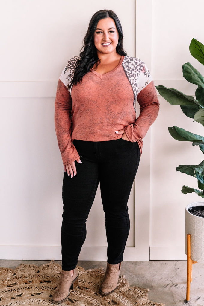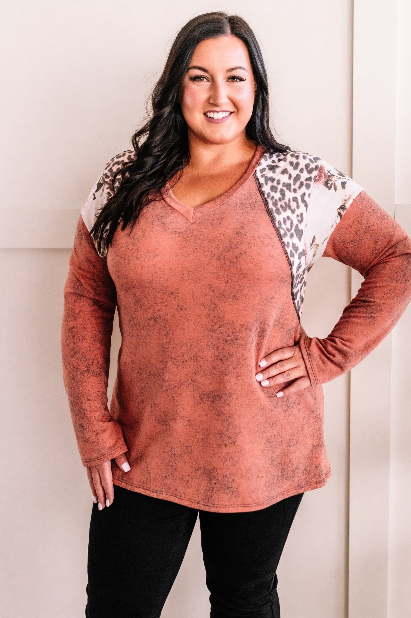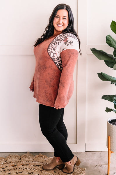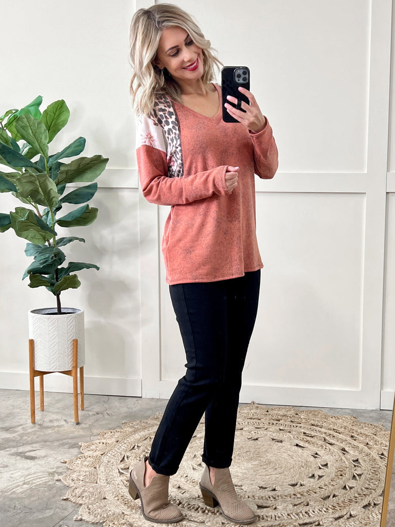 V Neck Top With Contrasting Floral Sleeves In Heathered Redwood