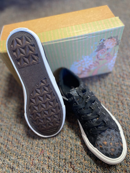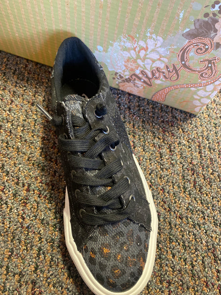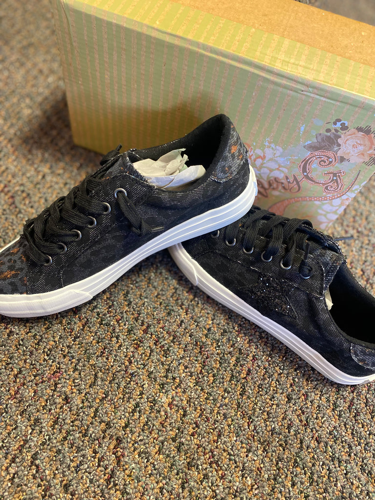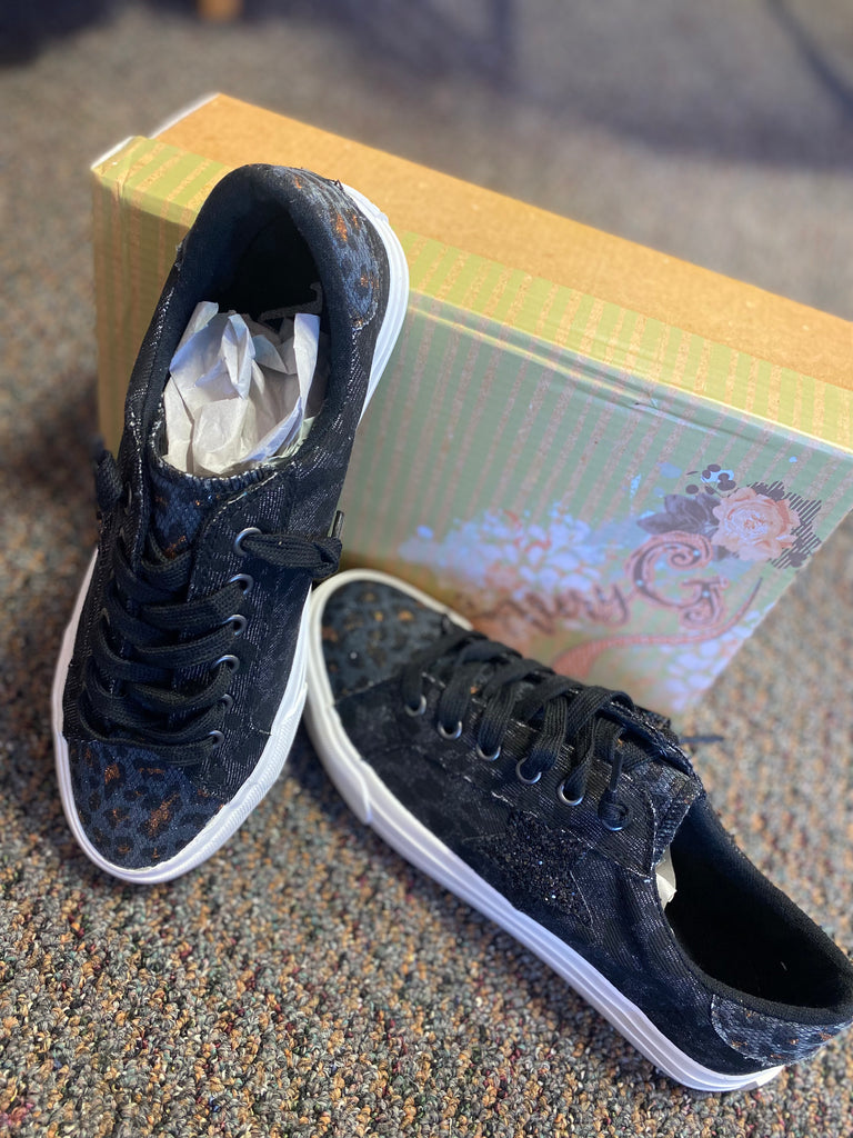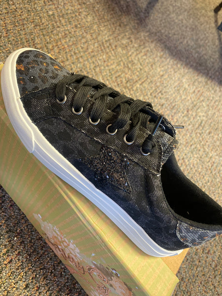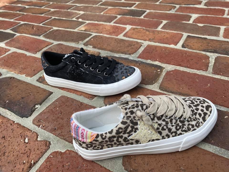 You'll LOVE these Adorable Black Sneakers with Black Glitter Star and cute leopard back detail. They're great to throw on with your shorts and jeans and favorite graphic tee!